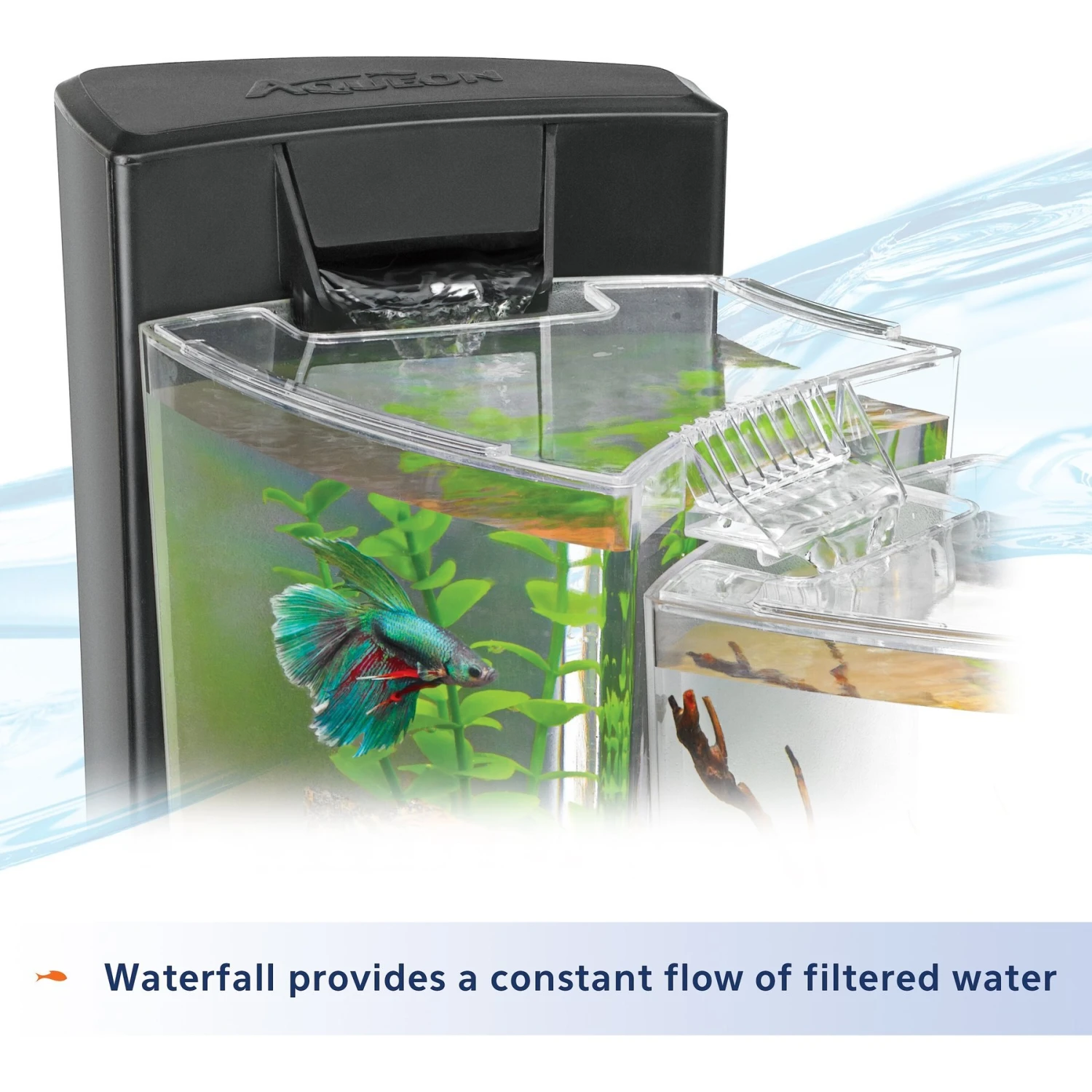 - Includes Aqueon QuietFlow power filtration, an internal pump to adjust water flow, betta food and water conditioner.