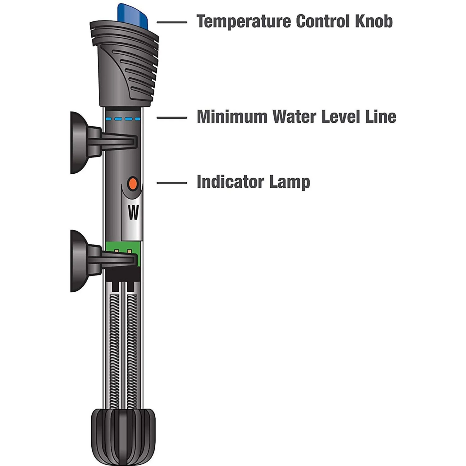 - Durable shatter-resistant heater construction allows for completely submersible and safe aquarium temperature control.