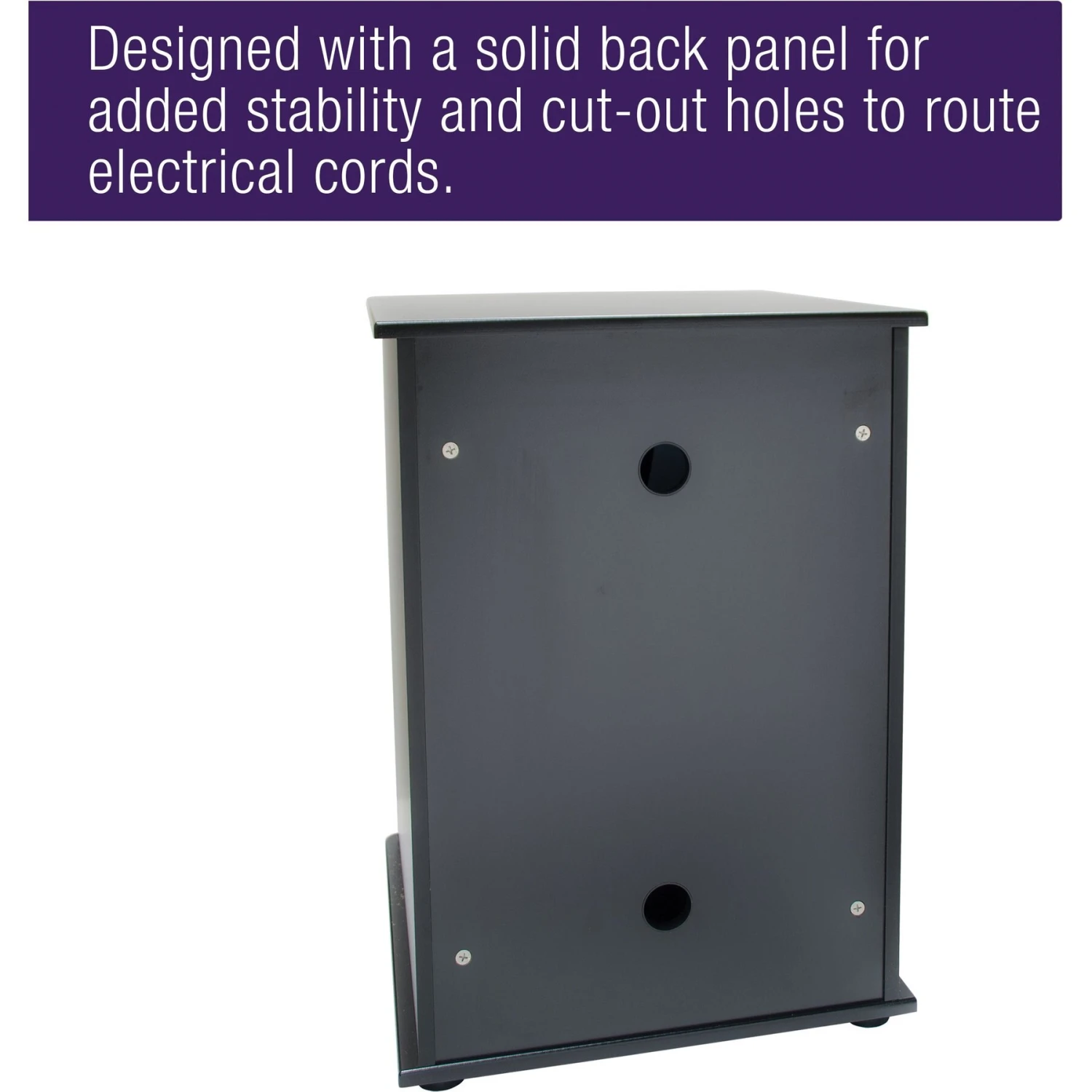 - Designed with a solid back panel for added stability and cut-out holes to route electrical cords.