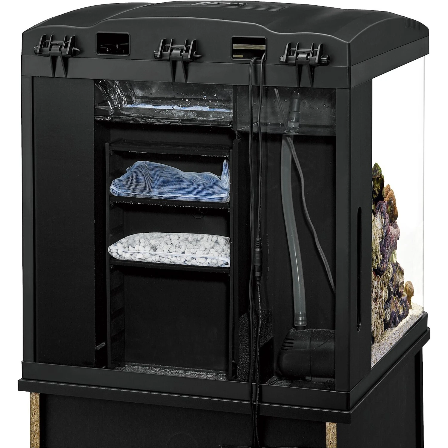 - Features a compact and customizable filtration chamber built into the back of the aquarium.