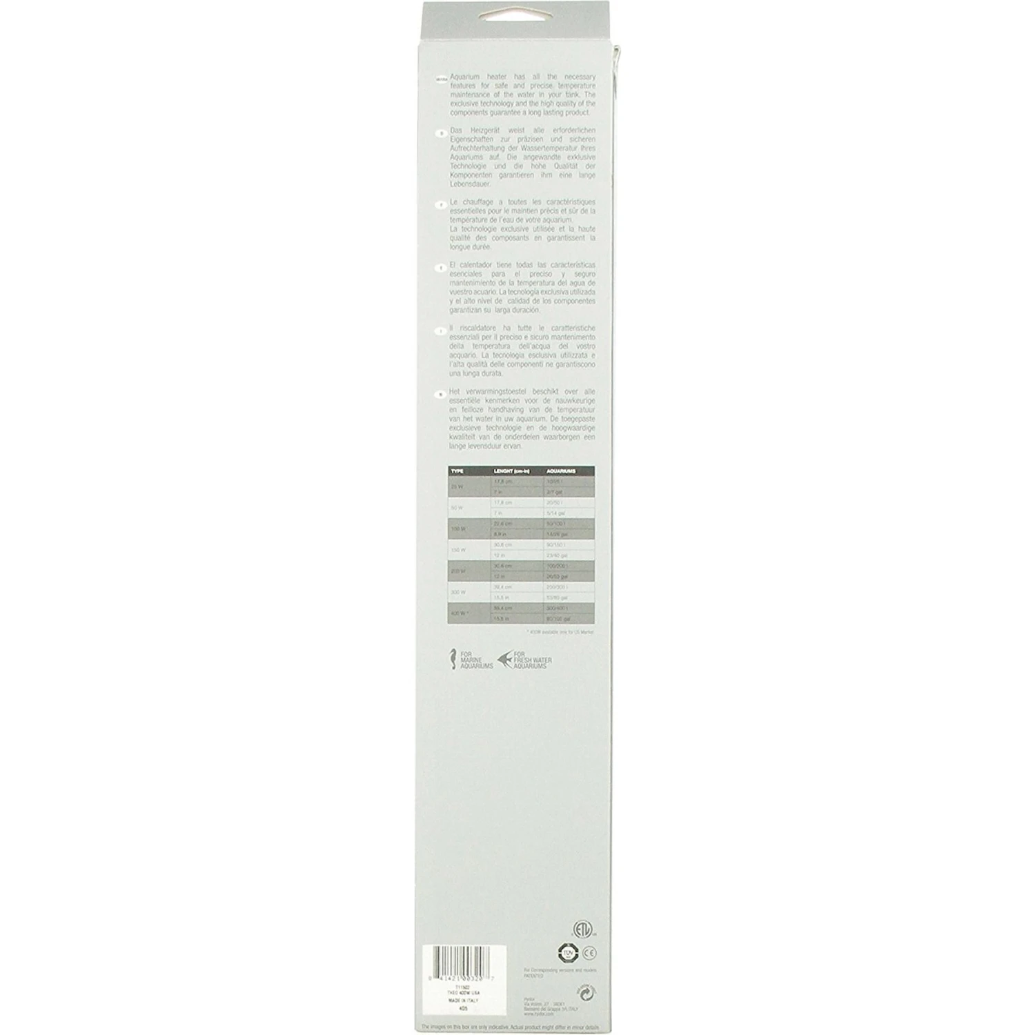 The Hydor Theo Shatterproof Aquarium Heater is designed with exclusive technology and high-quality components for longevity. This heater has all the features needed to safely and precisely maintain the water temperature in your aquarium. This aquarium heater is submersible, anti-thermal shock, highly resistant and features a graduated scale for precise temperature regulation. It also features self-control limiting technology, so if it senses abnormal functioning, the patented PTC heating system guarantees safe operation in case of dry running. Plus, you can position this heater horizontally or vertically!