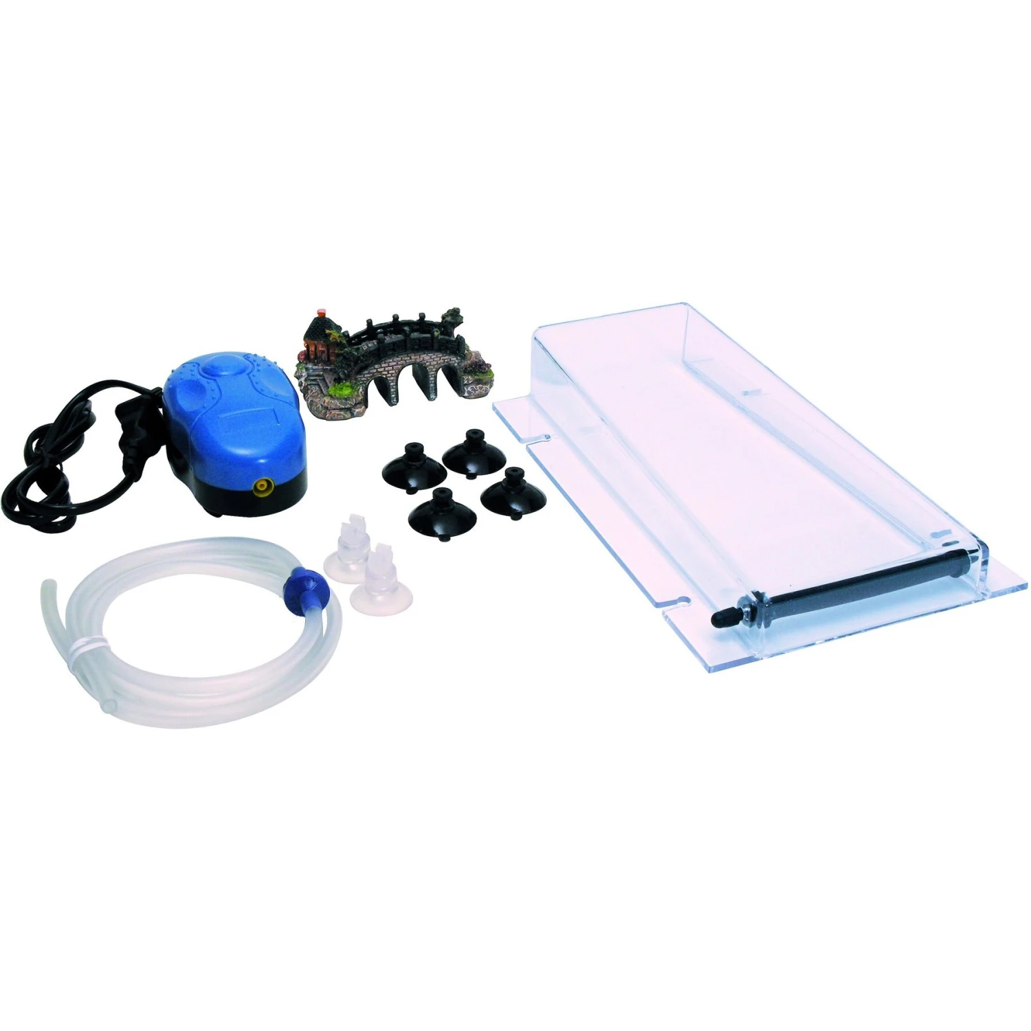- Complete kit comes with an air pump, check valve and fittings, decorative ornament, tubing, river housing and suction cups.
