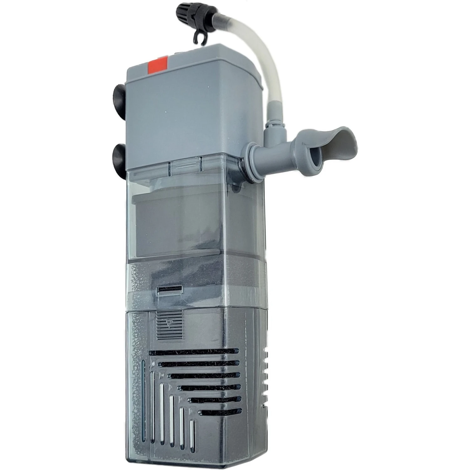 - Features a mechanical sponge filter and carbon media chamber.
