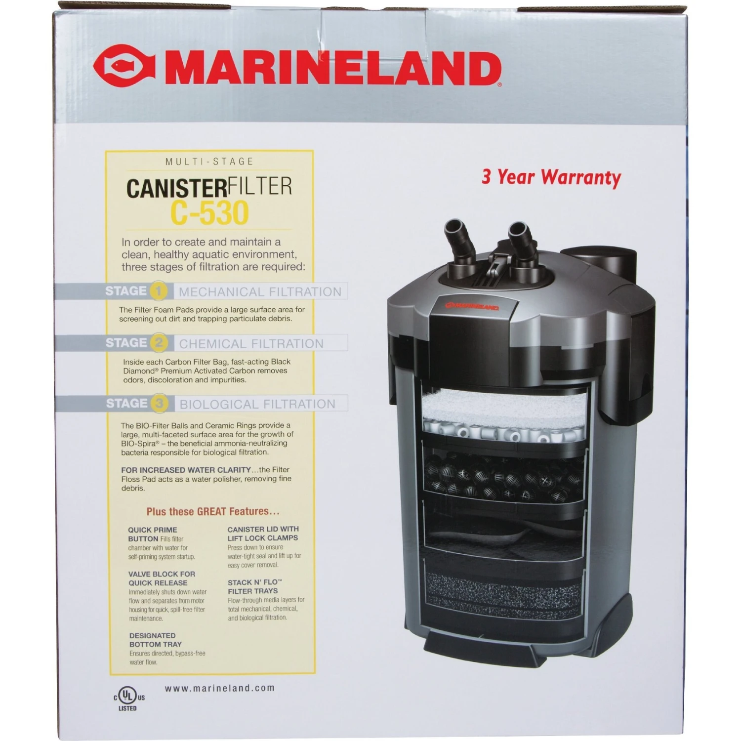 Marineland Multi-Stage Canister Filter is designed with an effective 3-stage filtration system consisting of biological, chemical and mechanical filtration. The bio-filter balls are designed to grow the beneficial bacteria that are needed for biological filtration, and excel at removing toxic ammonia and nitrites. Unlike other canister filters, Marineland Multi-Stage Canister Filter has no bypass option, meaning that it only has the ability to produce clean water. The replaceable media slots provide the mechanical and chemical filtration, screening out dirt and debris while removing odors, discoloration and impurities. The 100% water-to-media contact ensures a crystal clear, healthy environment for your plants and marine life. This 3-stage, clean water-producing system will guarantee that your aquatic environment thrives to its highest ability.
