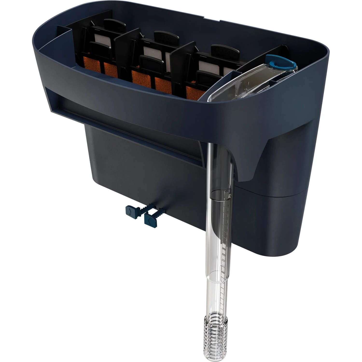 - Adjustable leveler for securing the filter to the aquarium rim, and adjustable telescopic intake.