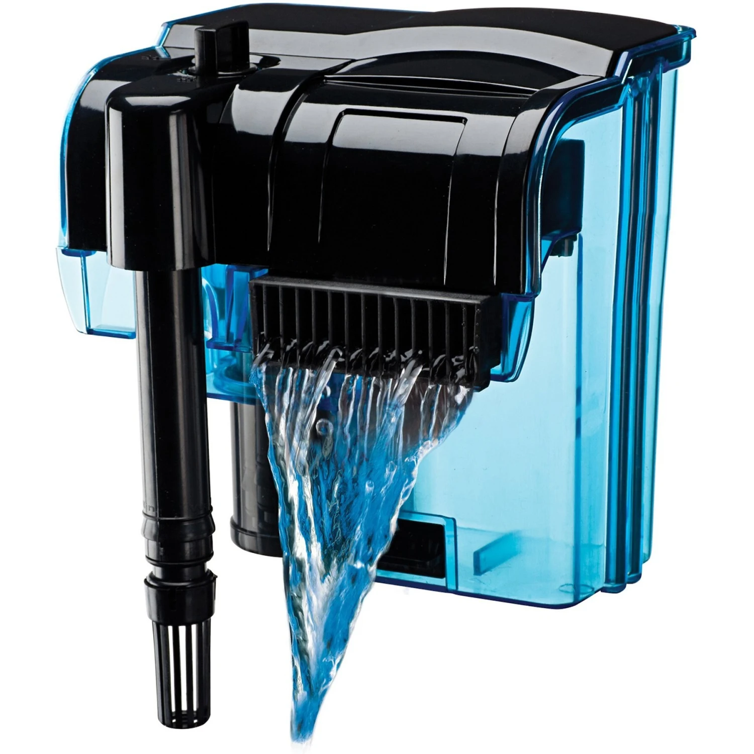 - Hang on filter fits over the edge of the tank glass and pumps up to 100 gallons per hour.