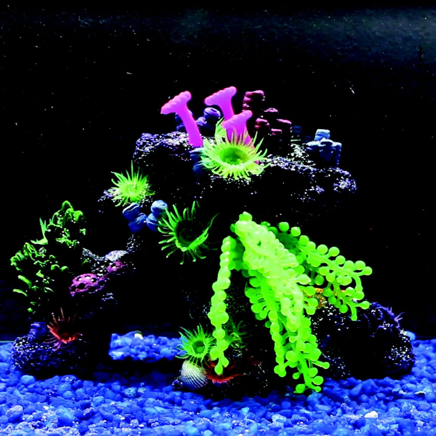 - Silicone plants sway with the water, vibrant colors resemble a coral reef.