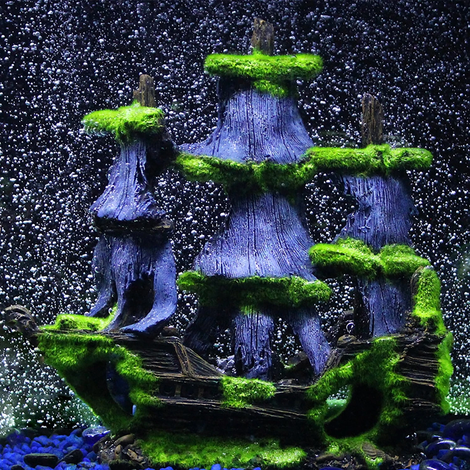 - Pirate ship, sunken urn and ship wheel resins create an engaging plant-scape.