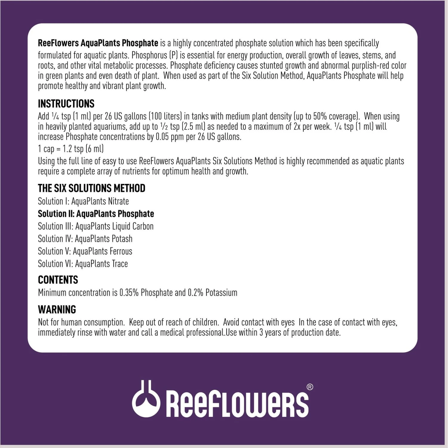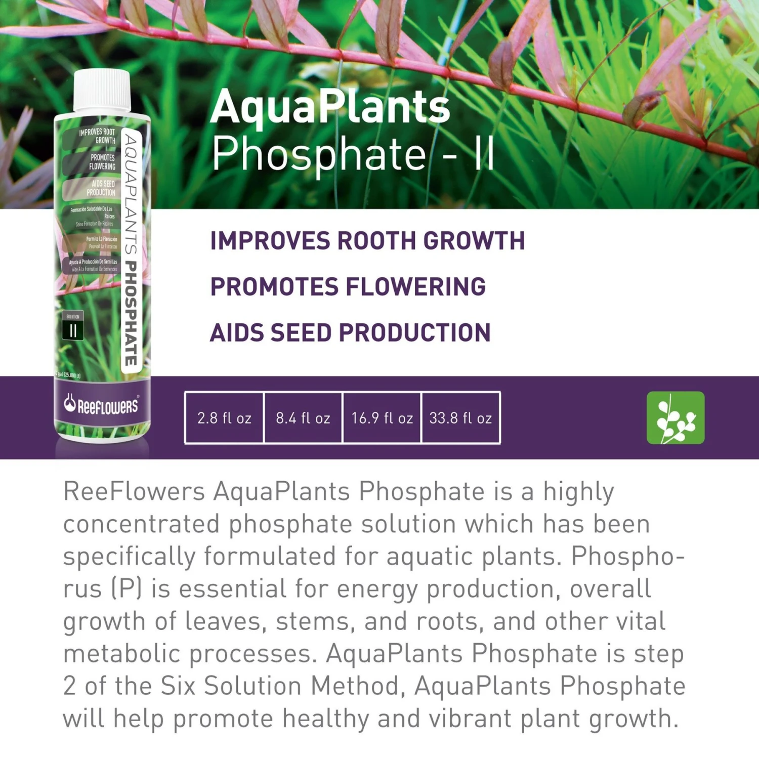 - Highly concentrated phosphate solution supports aquatic plant growth.
