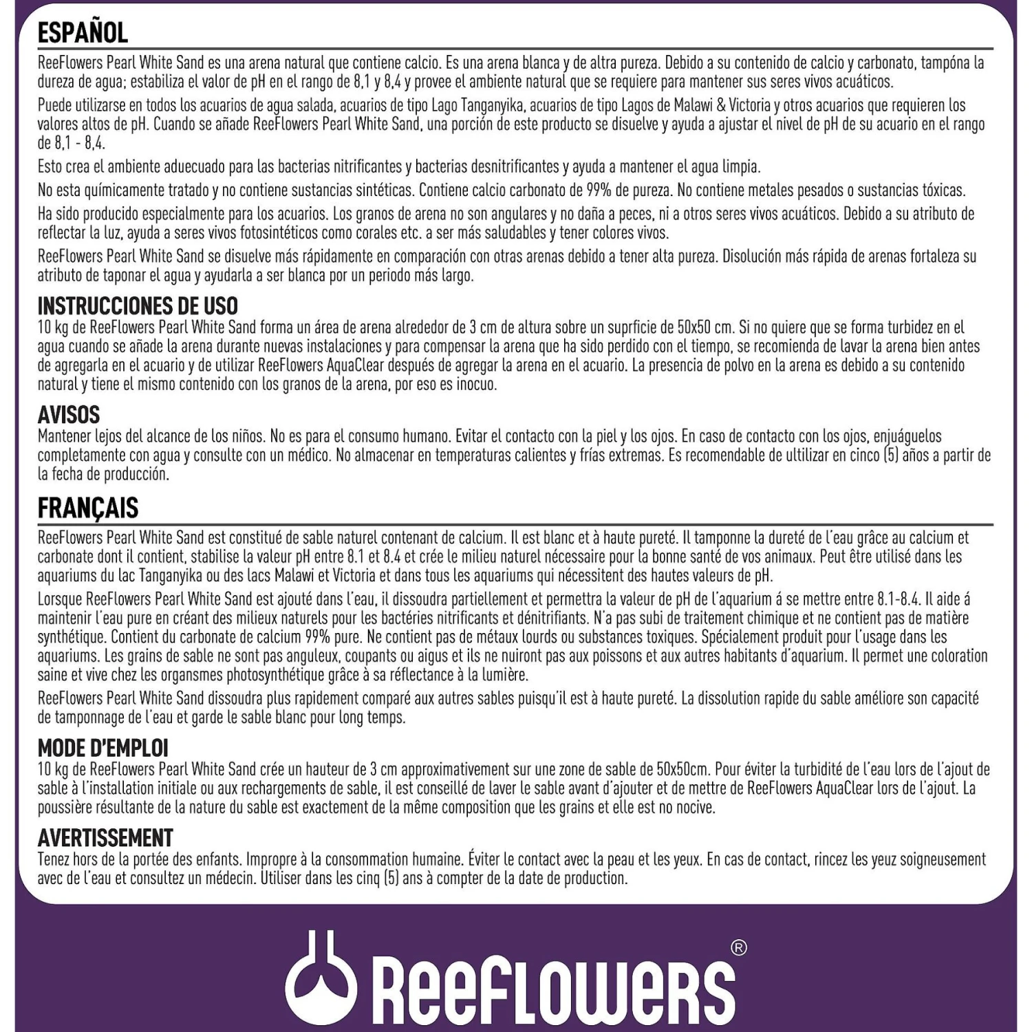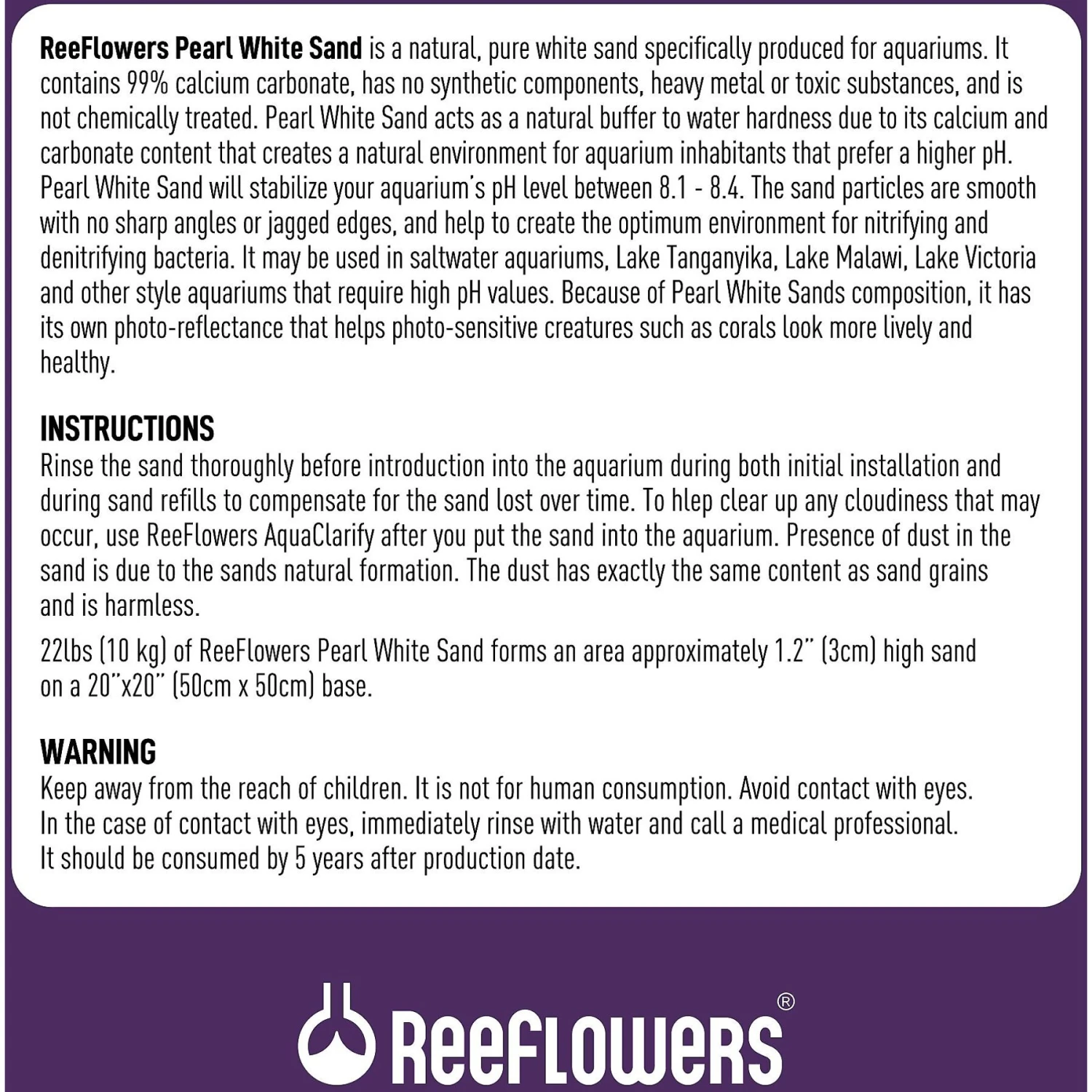 Rinse the sand be thoroughly before introduction into the aquarium during both initial installation and during sand refills to compensate for the sand lost over time. To help clear up any cloudiness that may occur, use ReeFlowers AquaClarify after you put the sand into the aquarium. Presence of dust in the sand is due to the sands natural formation. The dust has exactly the same content as sand grains and is harmless. 22 lbs (10 kg) of ReeFlowers Pearl White Sand forms an area approximately 1.2″ (3 cm) high sand on a 20″x20″ (50cm x 50cm) base. Particle Sizes: 0.5 – 1 mm, 1 – 1.5 mm